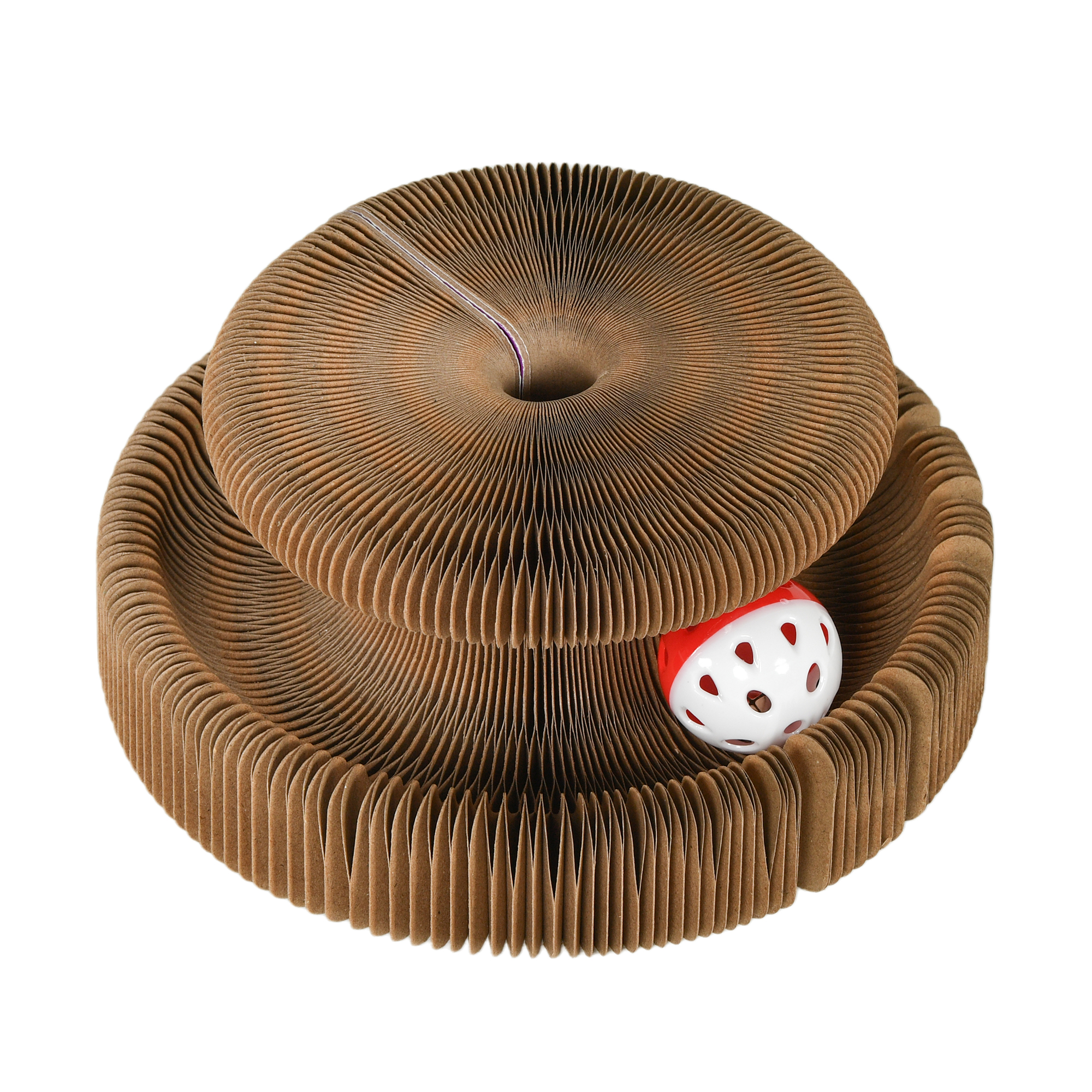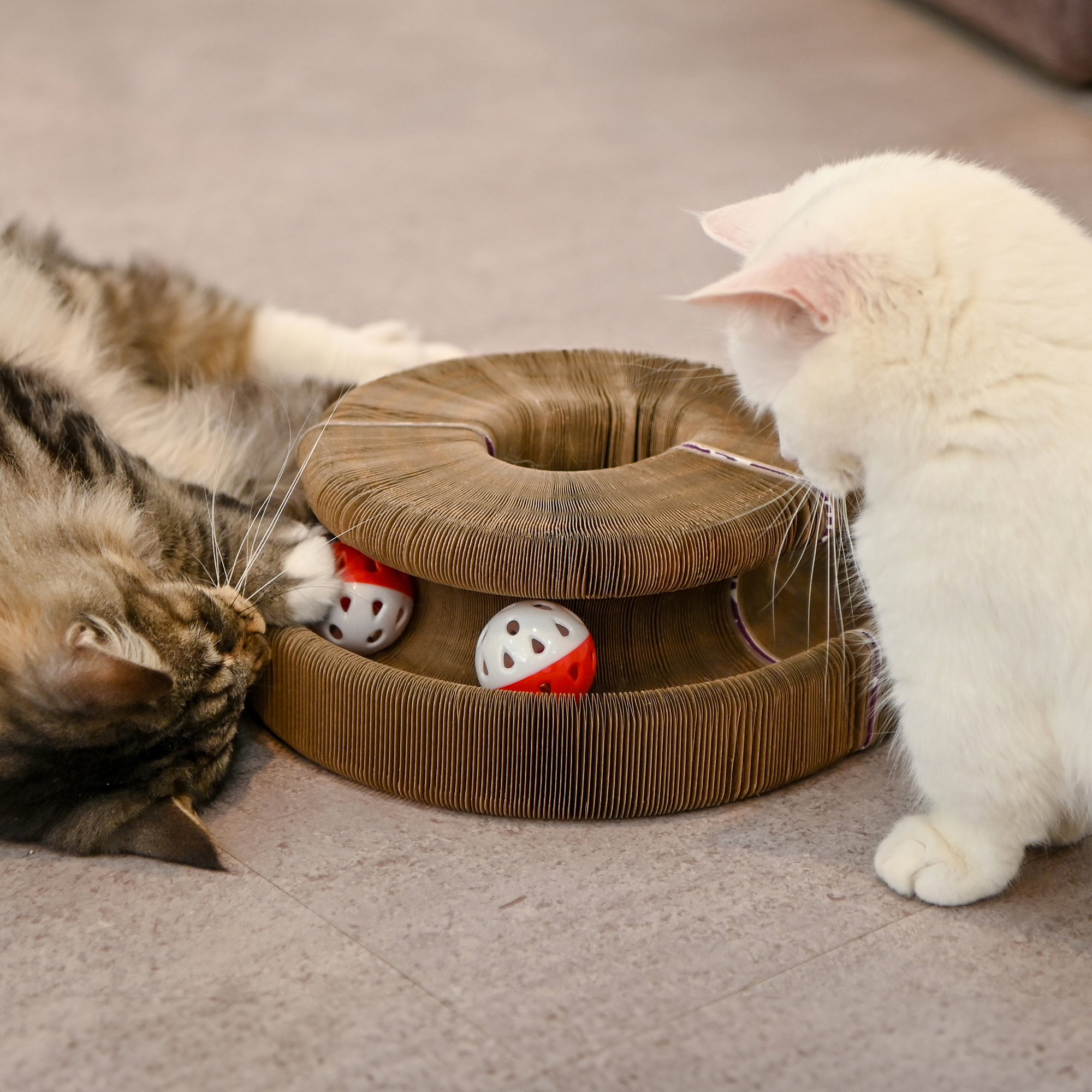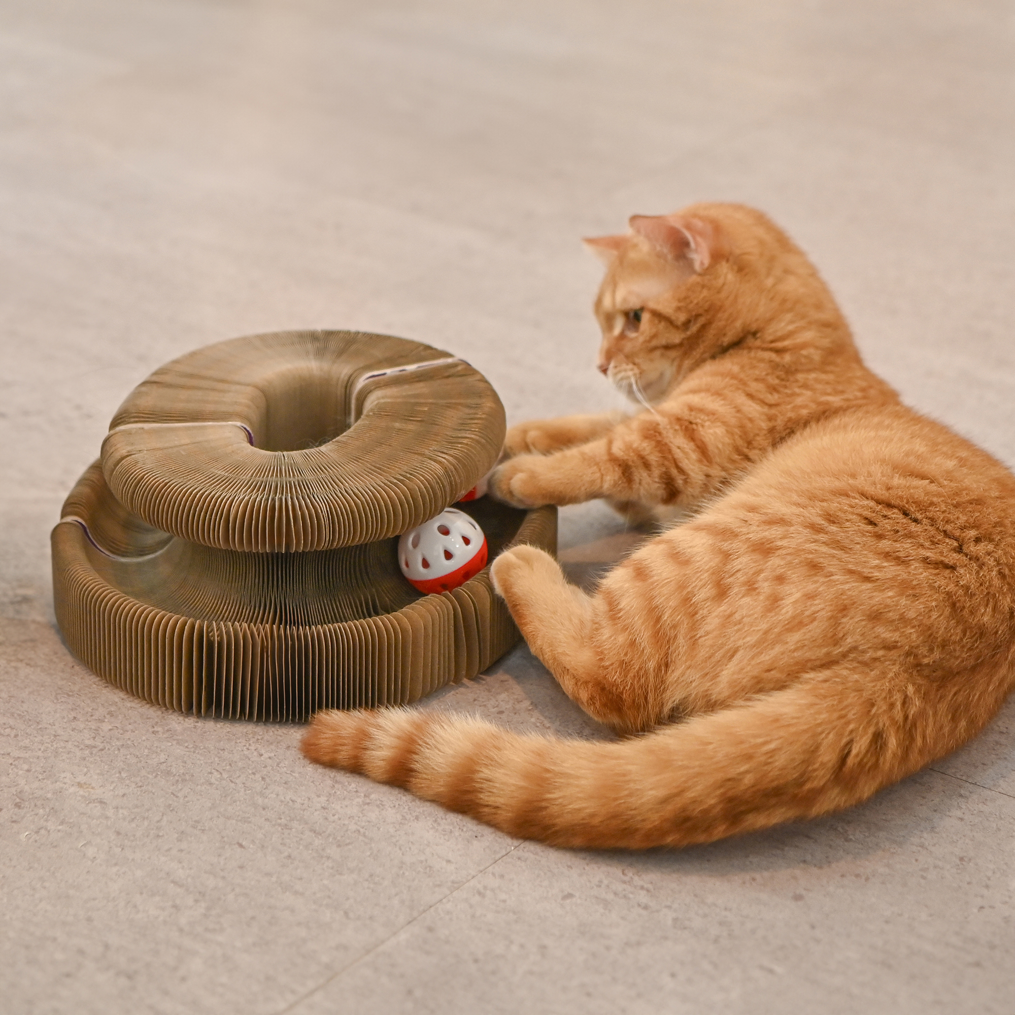 Gioco per gatti a fisarmonica, allungabile, palla con campanella all’interno e magneti che consentono di collegare insieme più giochi per il massimo divertimento