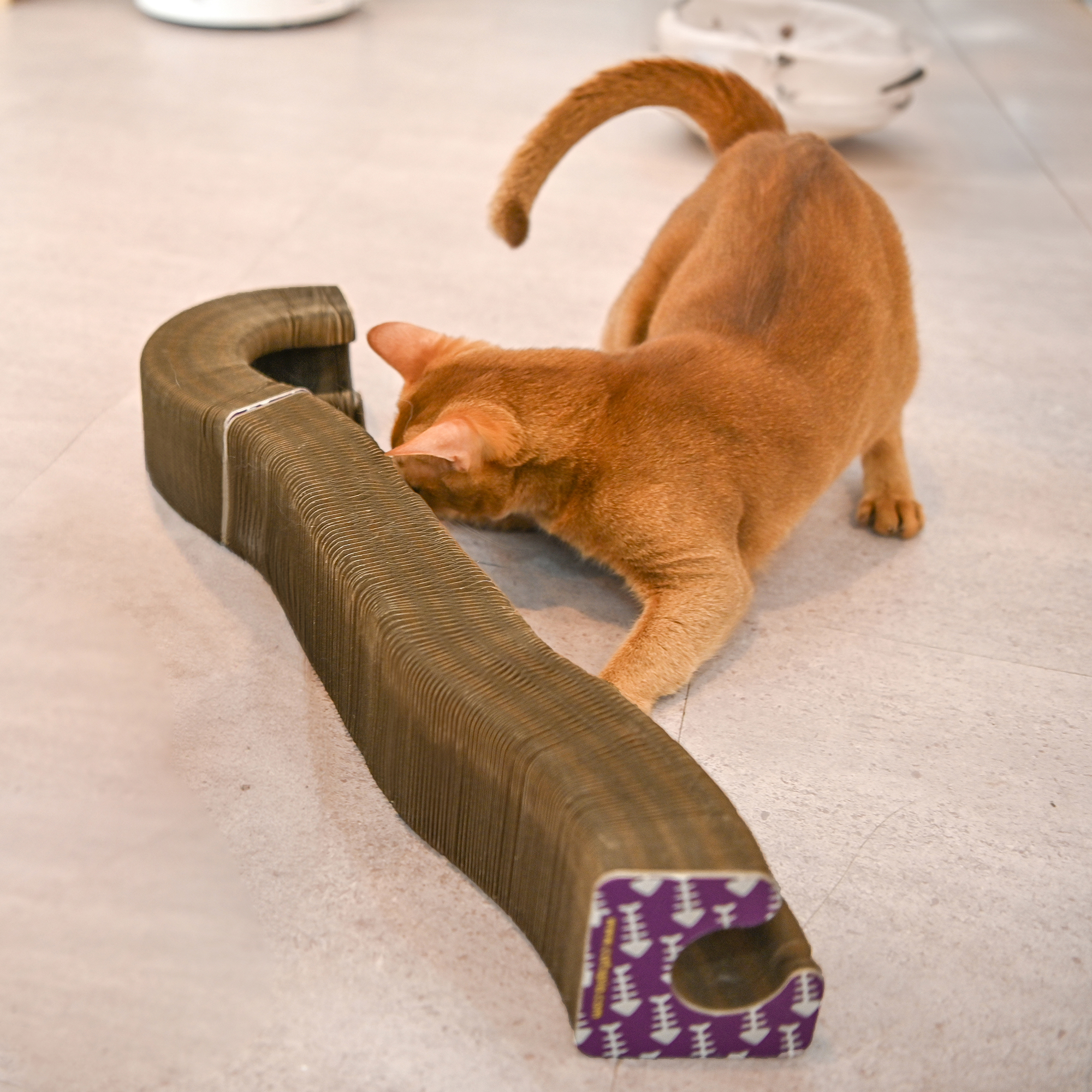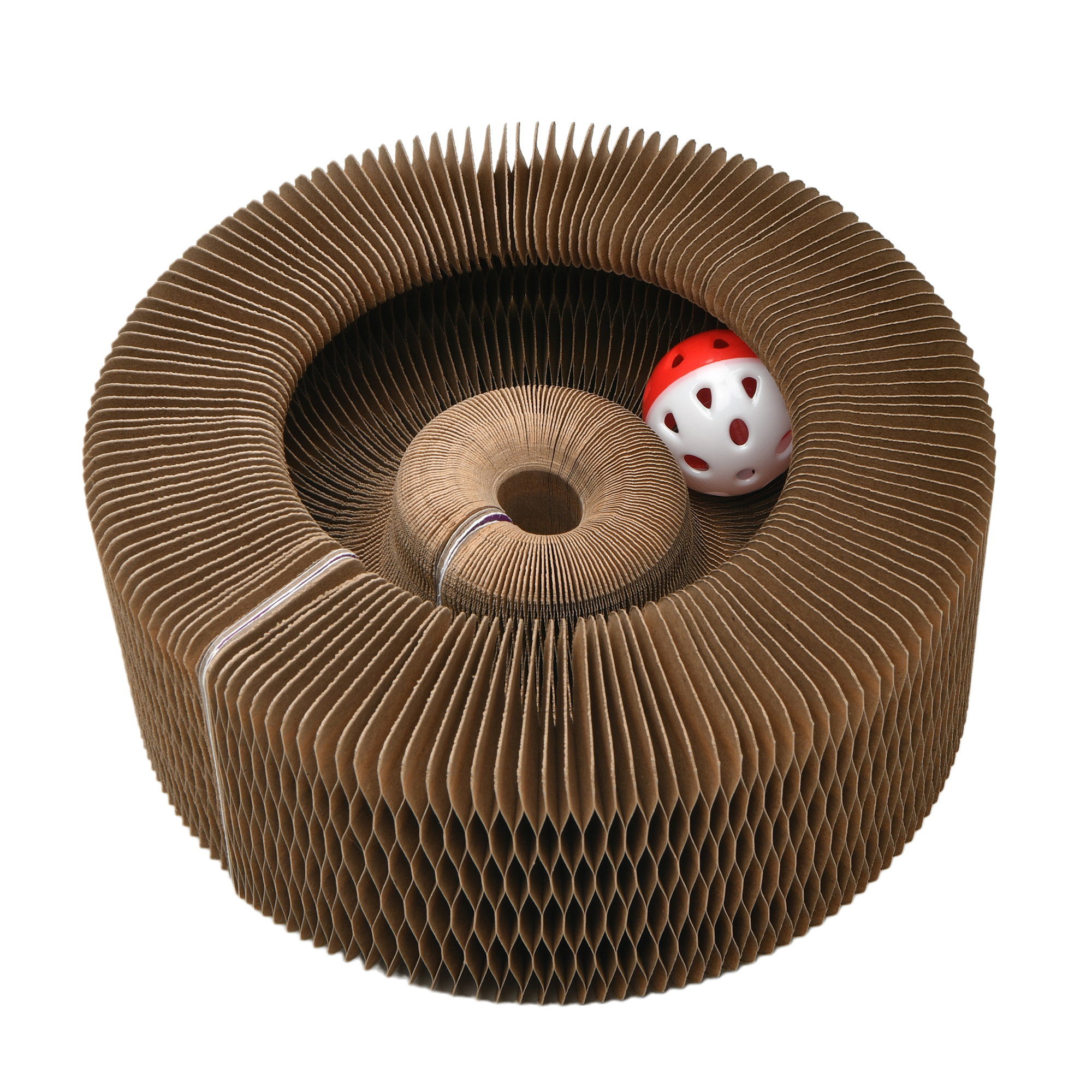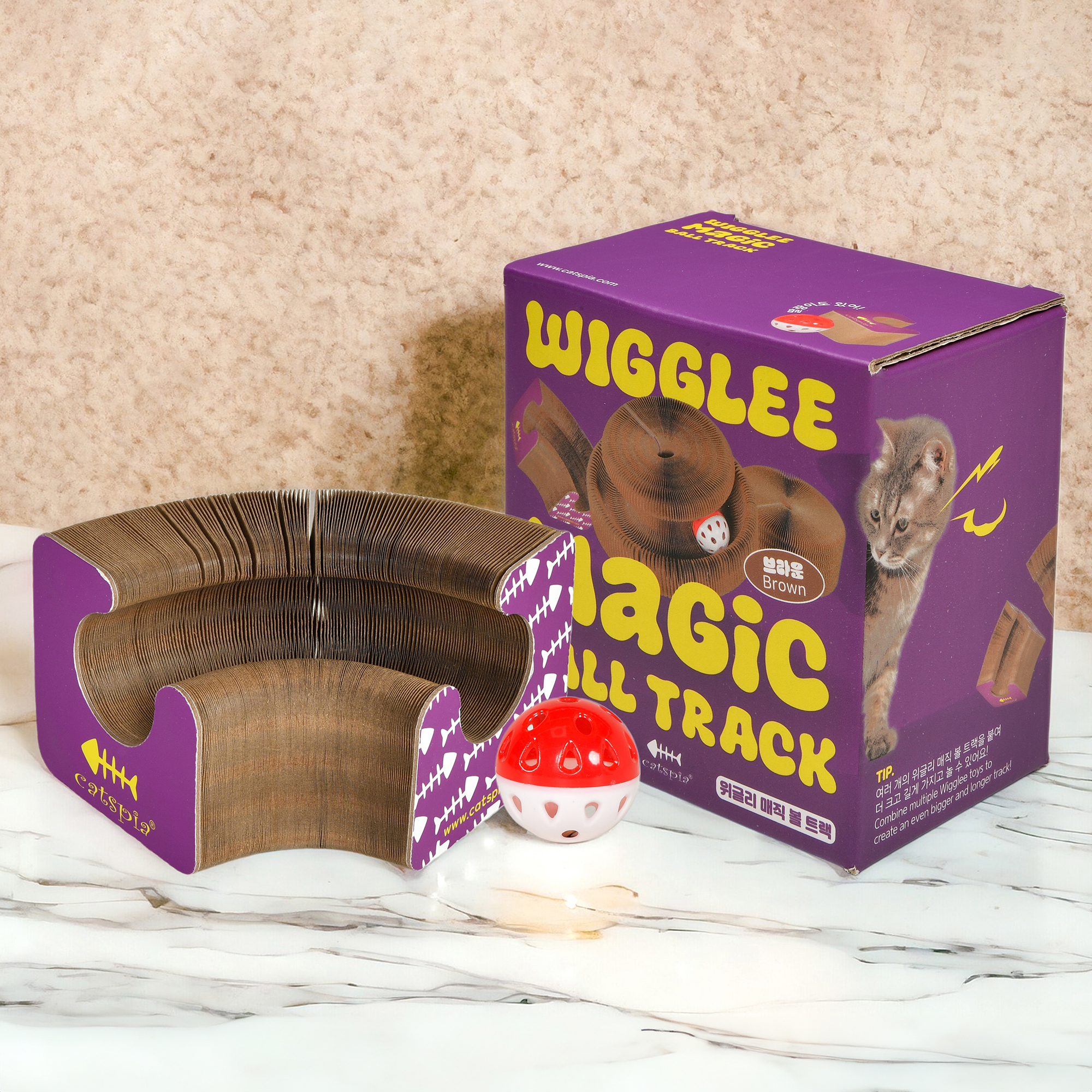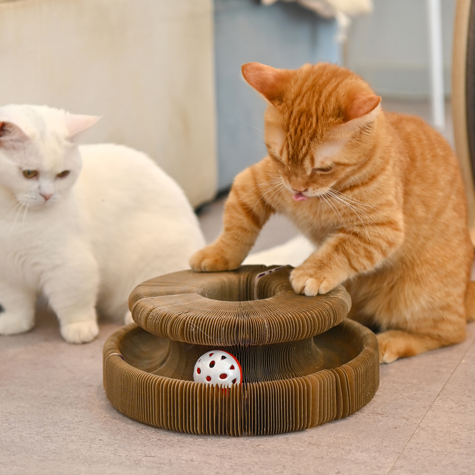 Gioco per gatti a fisarmonica, allungabile, palla con campanella all’interno e magneti che consentono di collegare insieme più giochi per il massimo divertimento
